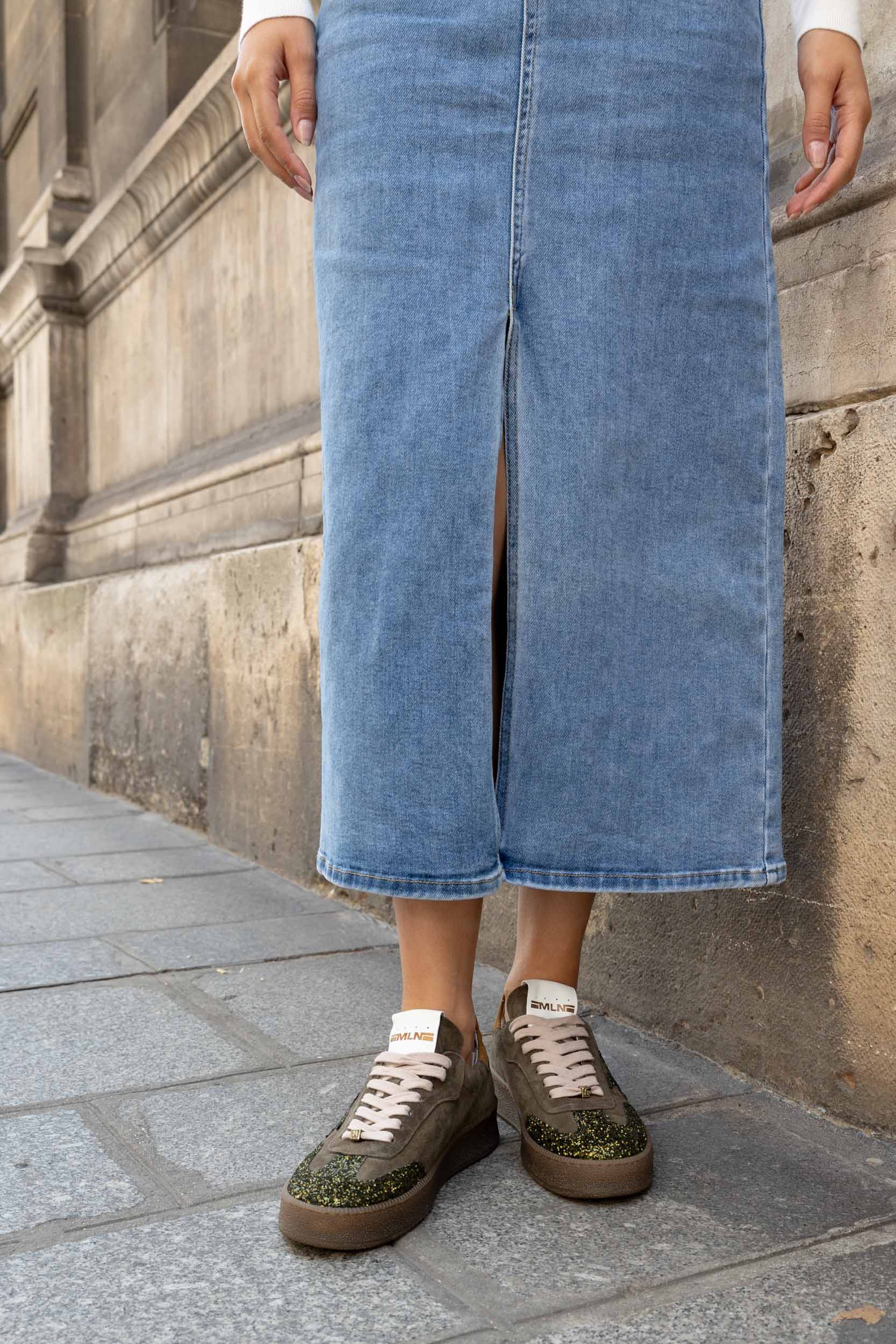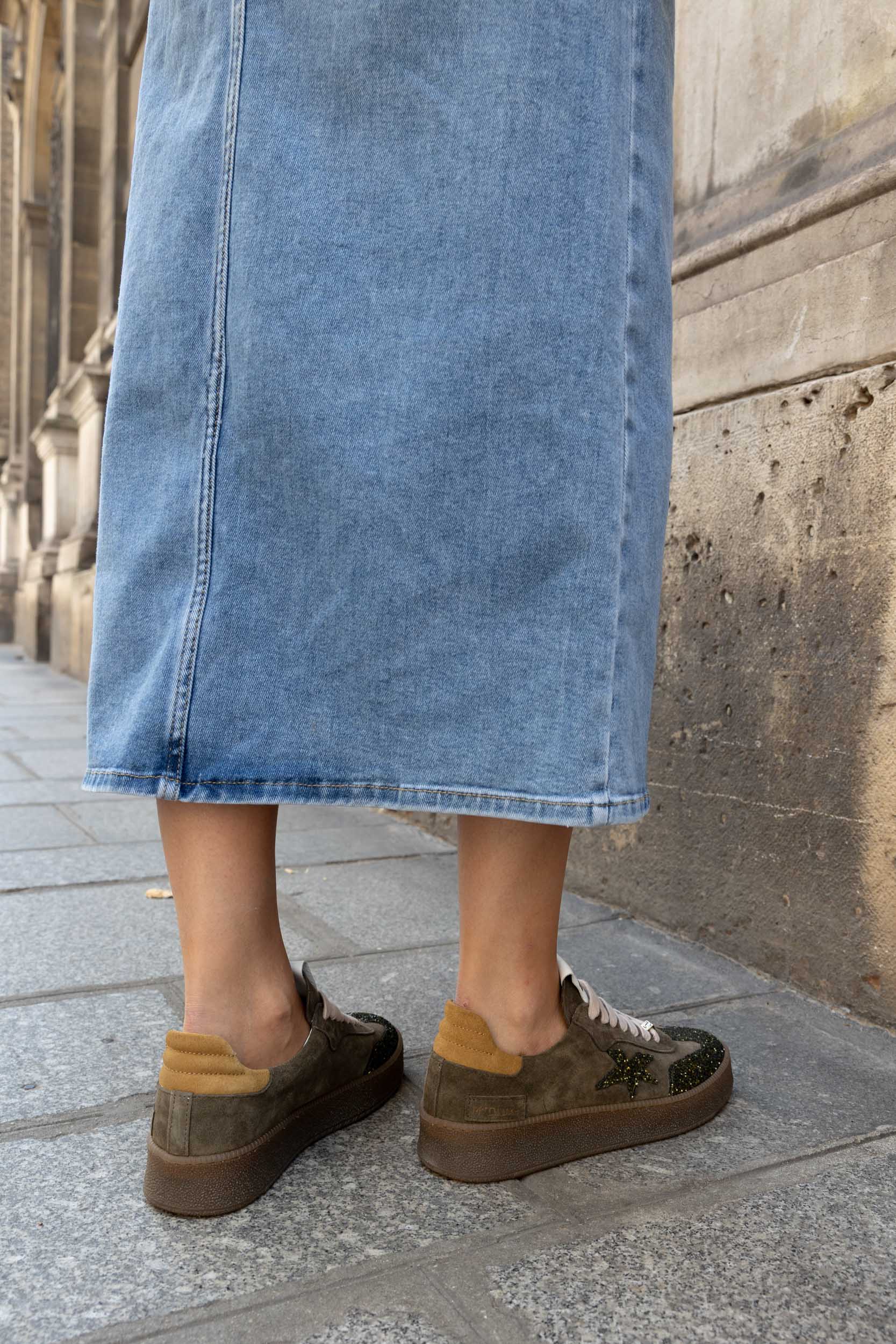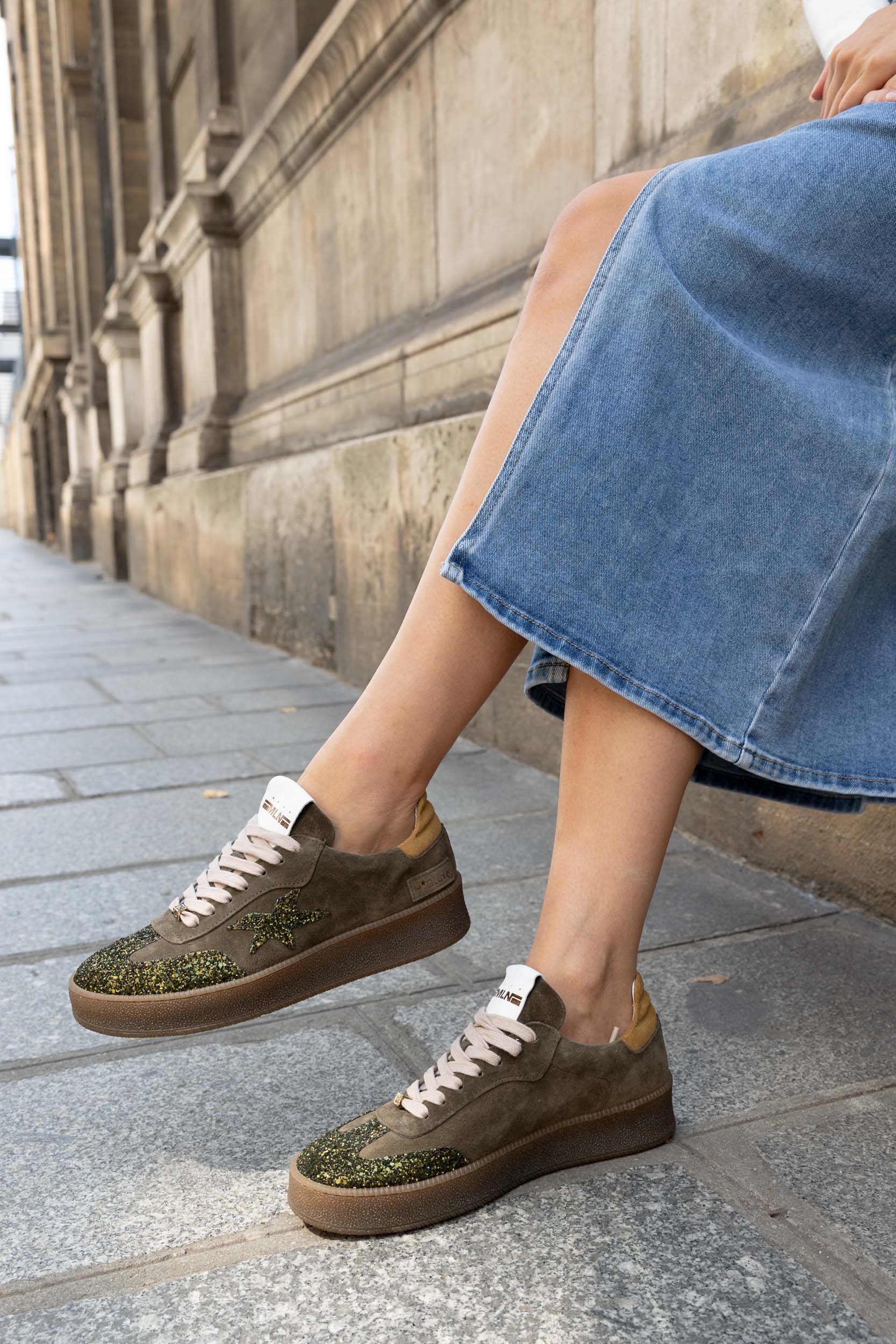 Un modèle original et lumineux qui mélange style casual et touche glamour. La base en daim kaki est sublimée par des empiècements pailletés verts sur le bout et le talon, ainsi qu’une étoile assortie sur le côté. La semelle marron apporte confort et résistance, idéale pour un usage quotidien.