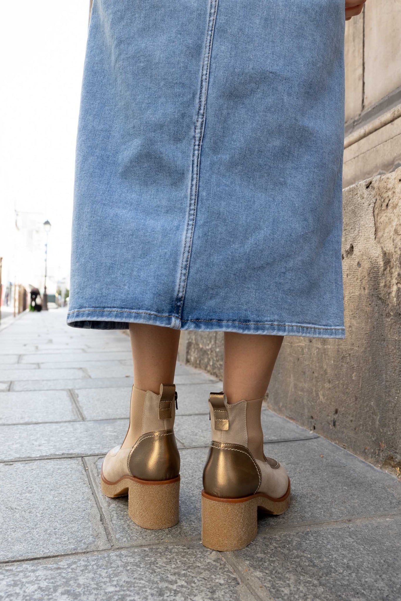 Cuir beige et doré métallisé fermeture par zip latéral empiècements élastiques ton sur ton talon carré de 5 cm stable et confortable semelle résistante modèle féminin et tendance parfait pour un look élégant et moderne.