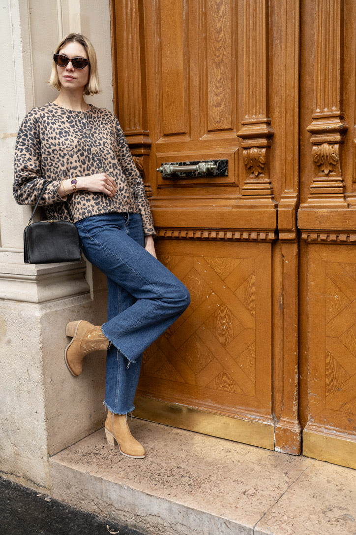 Cette bottine western en daim beige offre un design élégant et tendance, parfait pour un look bohème-chic.