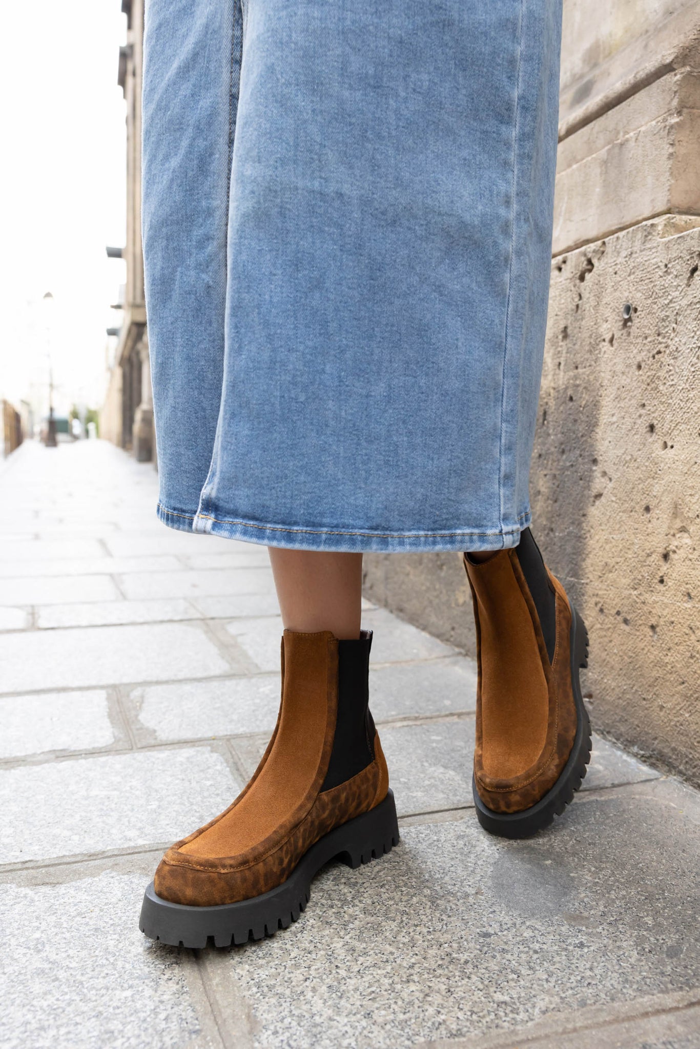 Bottines chelsea en daim camel et léopard avec semelle crantée noire.