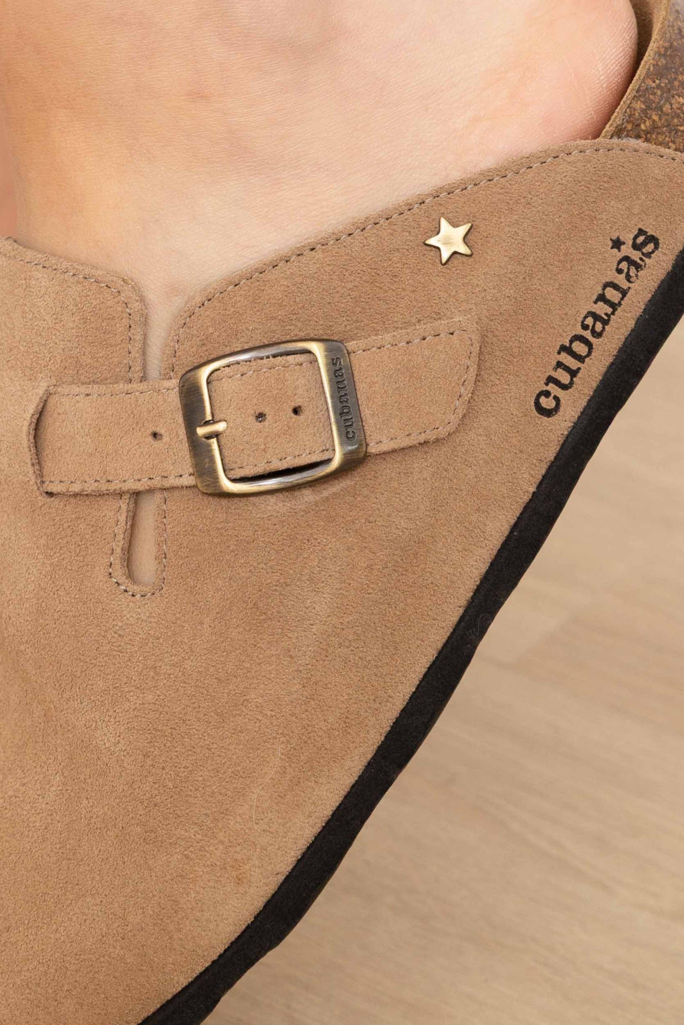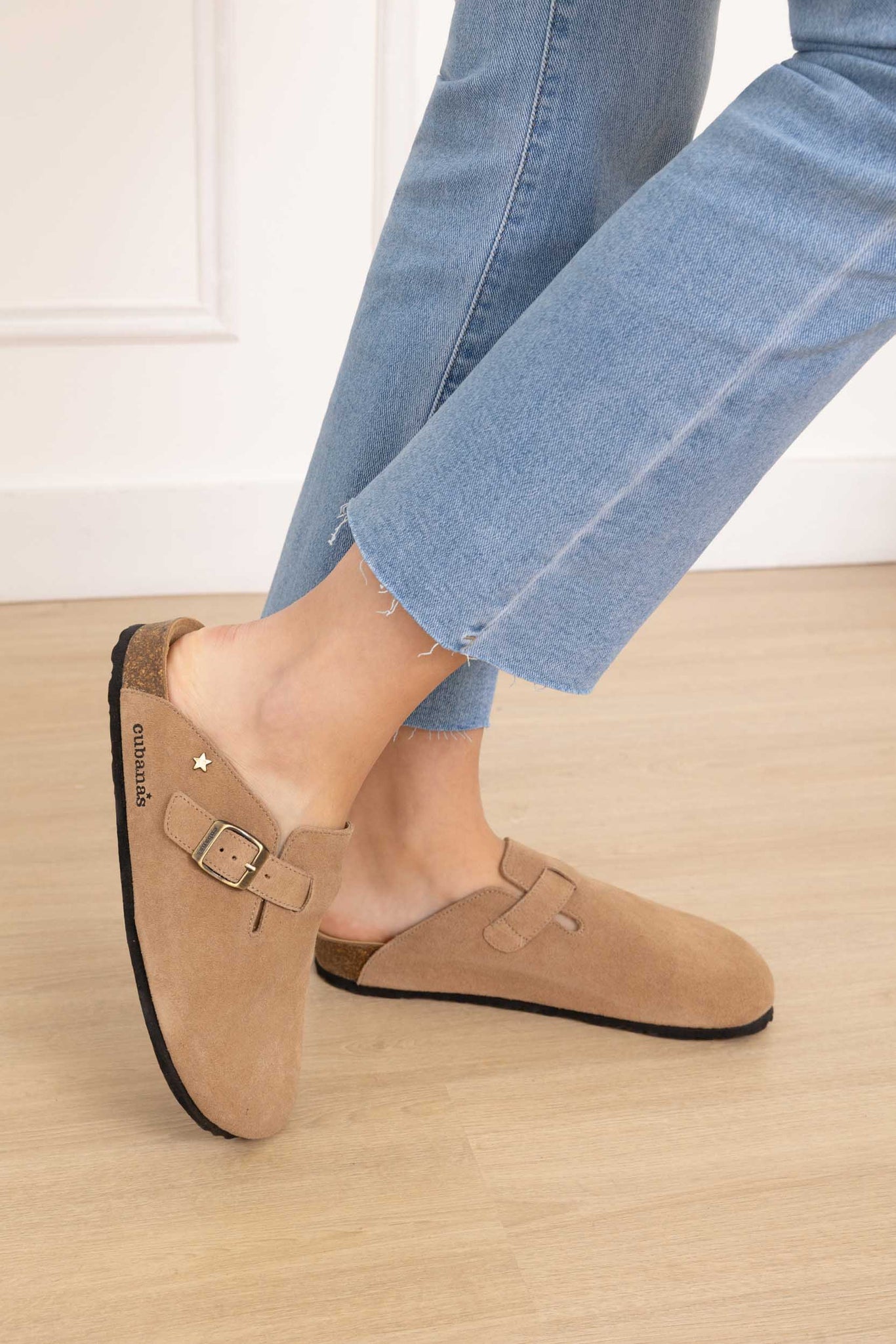 Alliez confort et style avec ces mules en cuir suédé beige. Leur design minimaliste et élégant est rehaussé d’une bride latérale ajustable avec boucle métallique dorée, permettant un ajustement parfait.