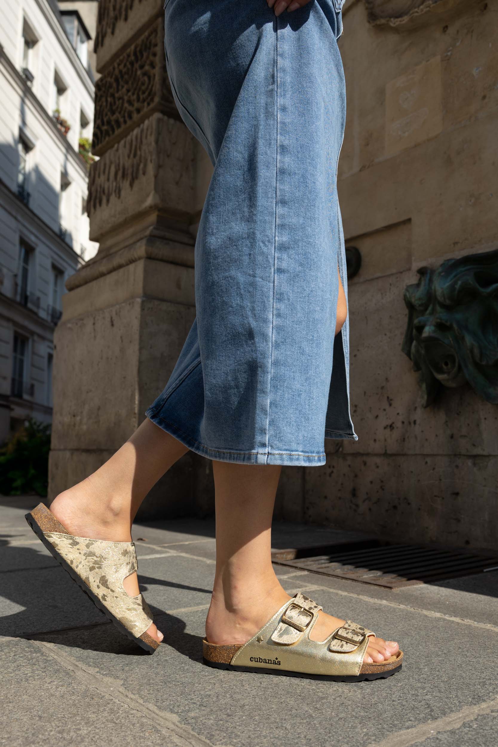 Laissez briller votre style avec ces sandales en cuir métallisé doré. Leur design à double bride ajustable et boucles martelées dorées offre à la fois confort et élégance. L’effet vieilli et texturé du cuir apporte une touche originale et tendance, parfaite pour sublimer vos looks estivaux.
