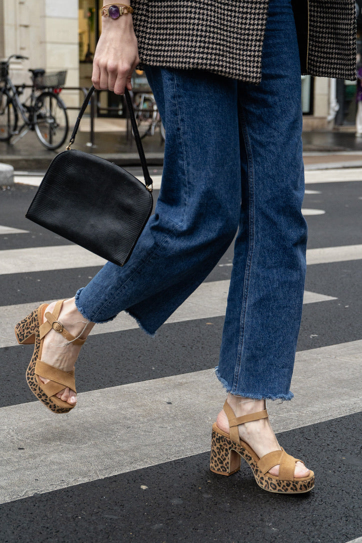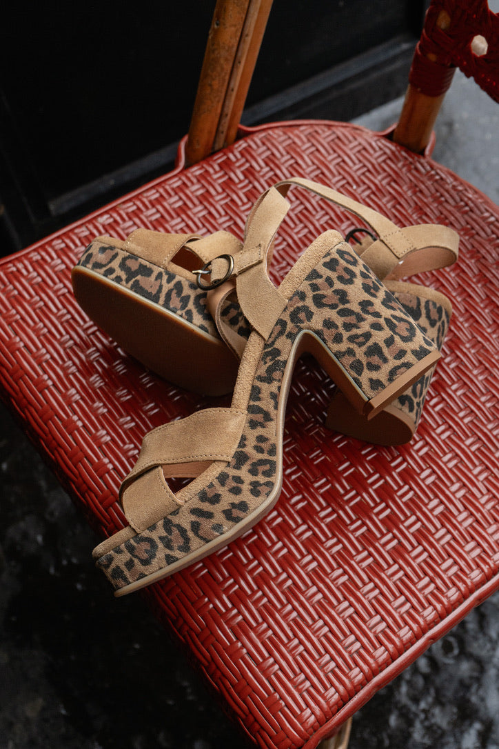 • Un mélange harmonieux de camel en daim et d’un imprimé léopard sur le talon et la semelle compensée, apportant une touche sauvage et élégante.