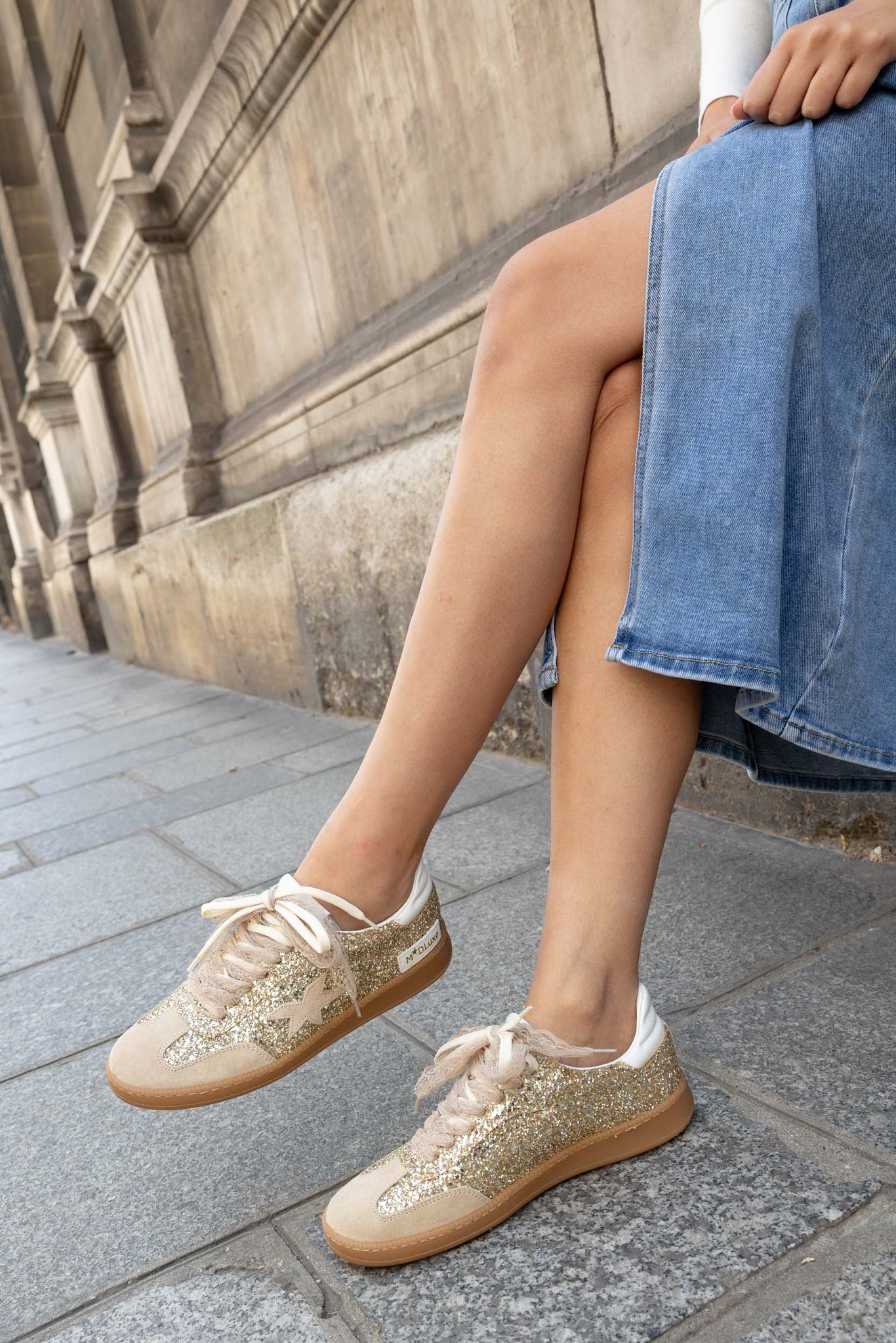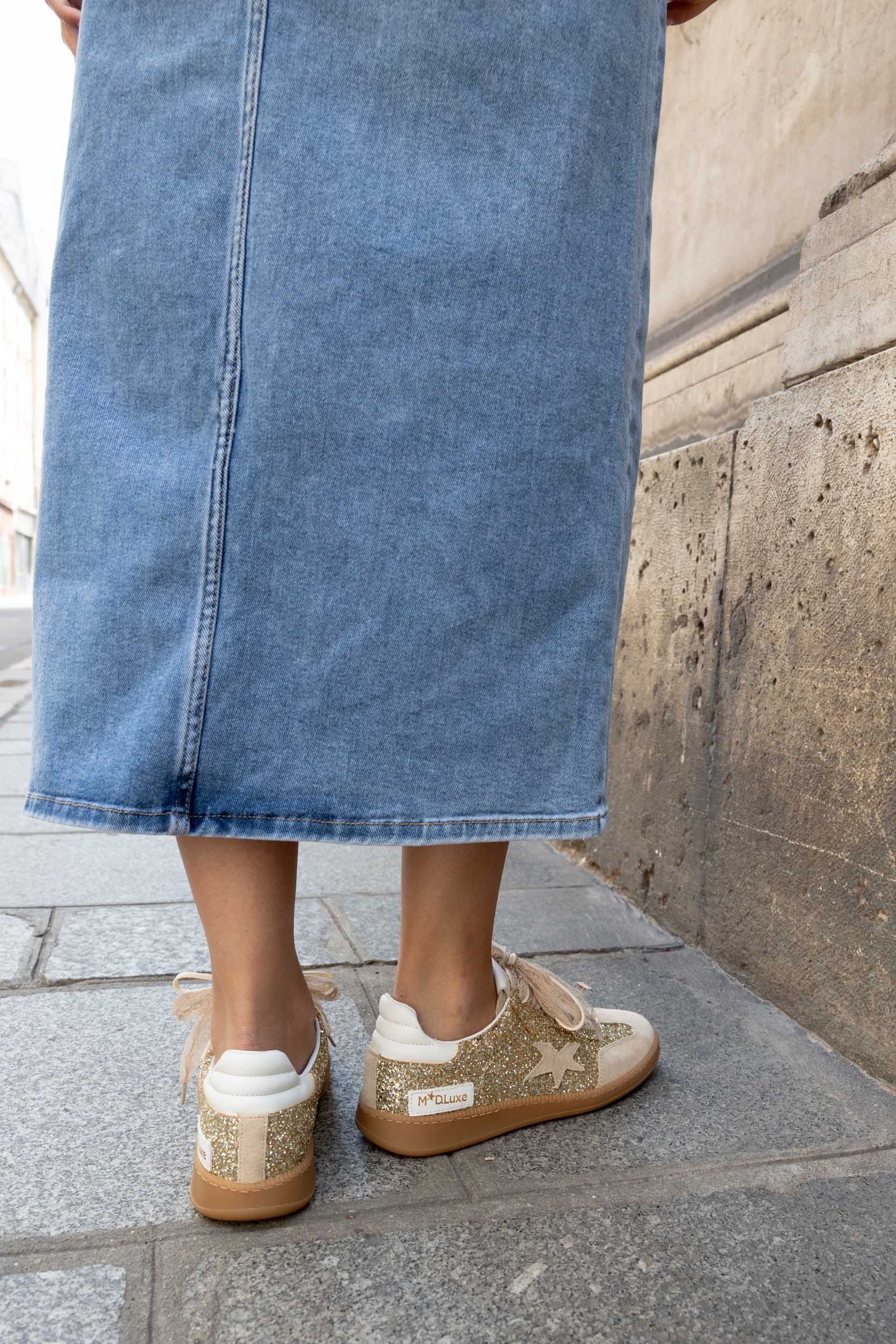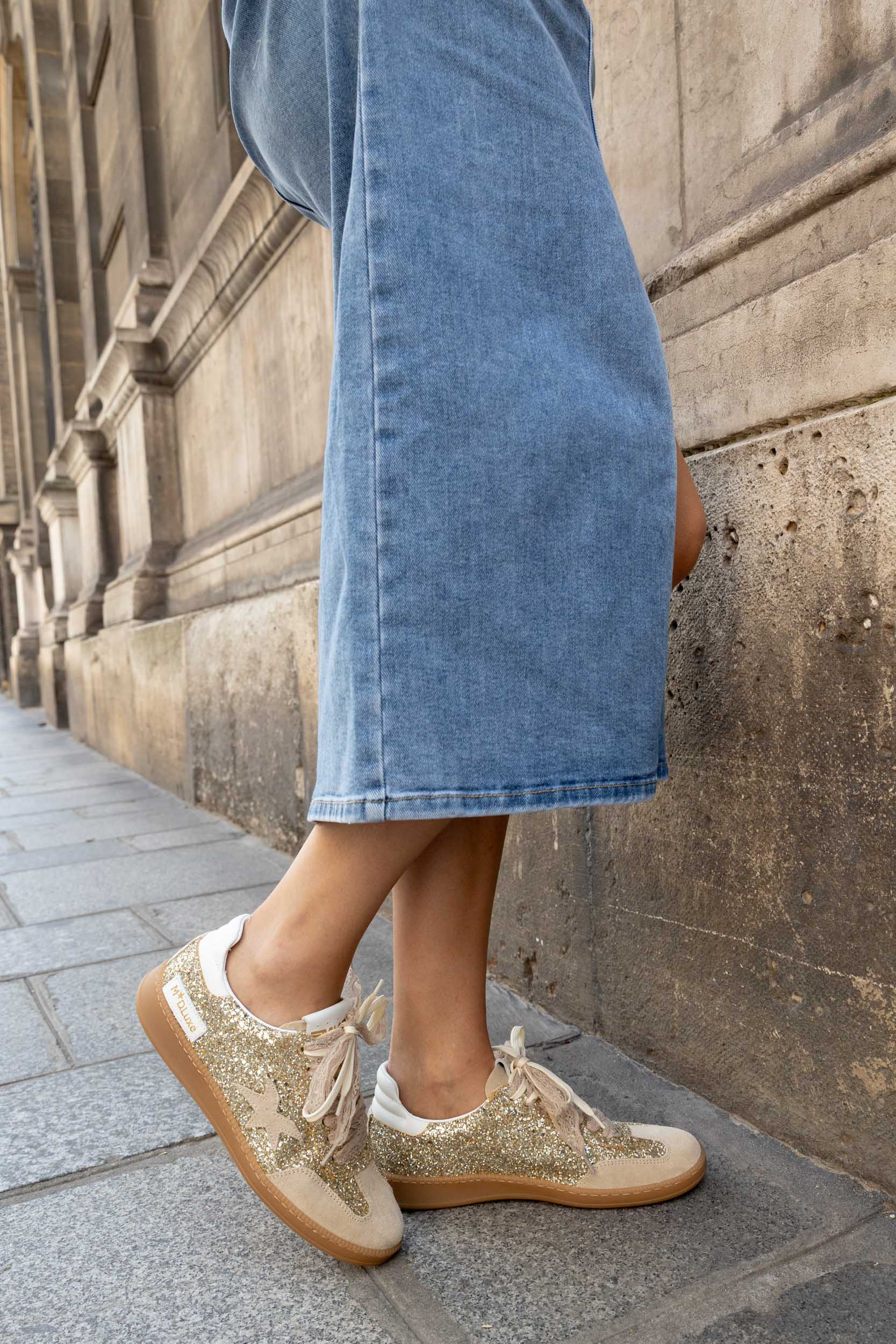 Baskets basses beige et doré pailleté.
